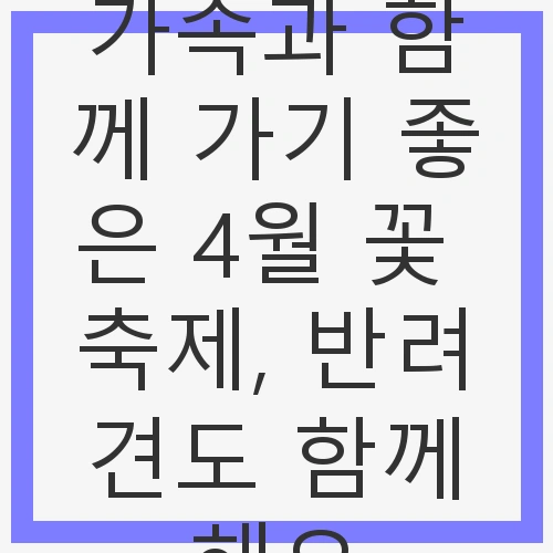 이번 4월, 가족과 함께하는 꽃 축제에서 행복한 시간을 보내고, 소중한 추억을 만들어보세요. 반려견과 함께하는 즐거움도 잊지 마세요. 꽃이 만발하는 봄의 아름다움을 만끽하시기 바랍니다.